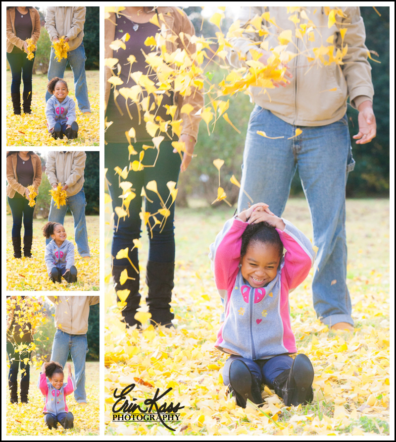 Because the girl had such a fun time playing in the leaves I decided to include it in the session. She threw them into the air herself like in the above pic but I wanted to get mom and dad in on it too. So I had them make it rain. I had her count to 3 and on three she was ready for the rain to start. When photographing children I often give them a little input into the session if they’re old enough. I talk to them to see what areas they like and pay attention to what they’re drawn to. If they’re interested, it makes my job a little easier!
