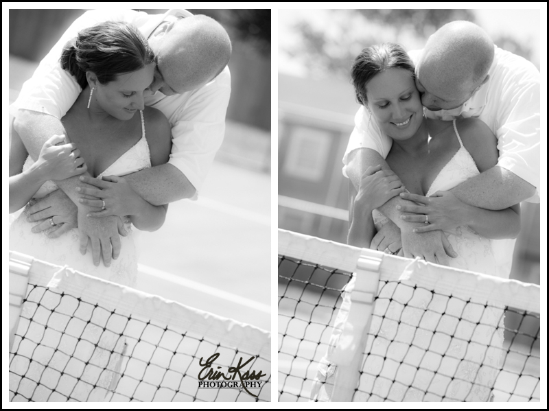For these images I had her stand still close to the net and him a few steps behind her. I told him to slowly walk up and wrap his arms around her in a big embrace. I told her to grab onto his arms and lean into him. I had my camera down and gave the directions for what to do while I was talking to them face to face. For the bigger positioning make sure you’re connecting directly with your ‘peeps’. Don’t hide behind the camera. Once I had my settings right, I held it up to my face while I told him to go.